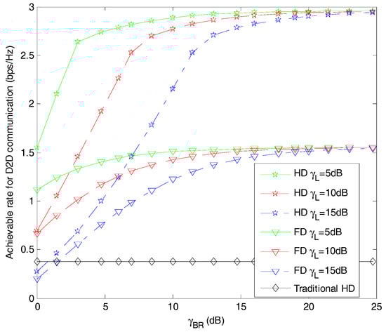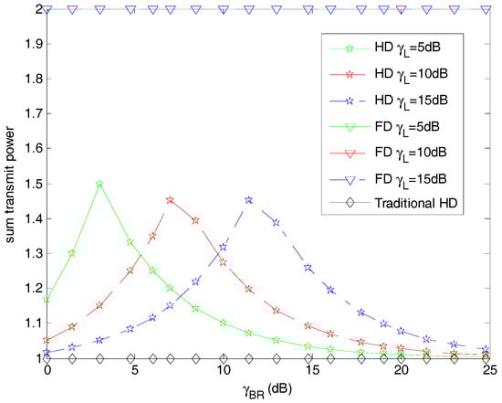 In Figure 6, we evaluate the sum transmit-power consumption of the system among the three algorithms. As we can see from Figure 6, the proposed hybrid-duplex relay mode consumes more power than the traditional HD mode and less than the FD mode. In the traditional HD mode, the D2D relay could receive and forward signals in two separate time slots. Therefore, the base station and D2D relay will use the maximum power to transmit signal. It can be seen that the sum consumed power is equal to one as the base station and the D2D relay consume the unit power at one half of frame, respectively. In addition, the FD scheme that we use as a benchmark assumes that the system will use a constant power of two. Different from these two benchmarks, the hybrid-duplex mode we propose in this paper will consume more power as increases to one particular value, and less power as increases continuously. The reason for this phenomenon is that the base station and D2D relay are forced to use more power to satisfy the transmission rate requirement and maximize the achievable rate for the D2D link. Moreover, as increases, less power is requested for the base station. It is also shown that the value of the inflexion point is greater as the channel gain of the loopback interference increases. The reason accounting for this phenomenon is that the greater the loopback channel gain, the higher the power consumption for the base station.