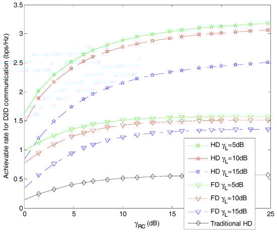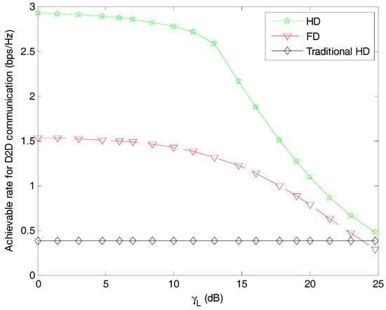 In Figure 4, we evaluate the impact of the loopback interference on system performance in terms of achievable rate for D2D communication. Herein, we set the optimal value of the slot splitting factor in our proposed hybrid-duplex scheme. It can be observed that, with the increase of the loopback channel gain, the performance of both FD mode schemes and our proposed hybrid-duplex mode scheme deteriorate. This is because of the nature of the two-antenna infrastructure which enables the D2D relay to receive and transmit signals at the same time. On the other hand, Figure 4 depicts that the achieved transmission rate for D2D communication with our proposed hybrid-duplex scheme is superior to the that of the conventional HD mode and FD mode.