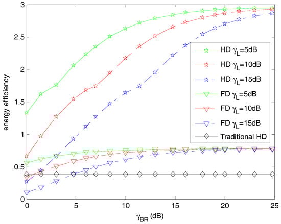 Furthermore, we investigate the energy efficiency of the different transmission modes in regard to in Figure 7. The simulation result reveals that the performance of the proposed relay scheme is superior to that of the traditional HD mode and FD mode. With respect to the average throughput in Figure 3 and the sum consumption of power for the system, our proposed hybrid-duplex relay mode yields the highest throughput gain when compared to the other two methods, and consumes a moderate transmit power. Consequently, the proposed hybrid-duplex relay scheme brings in a higher energy efficiency.