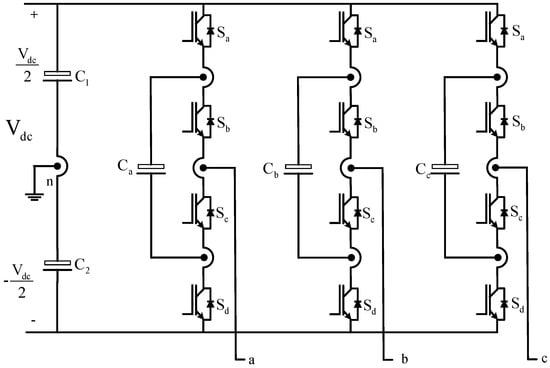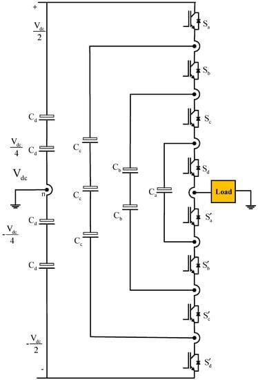 A corresponding topology for the NPC-MLI topology is the Flying Capacitor (FC), or Capacitor Clamped, MLI topology, it is depicted in Figure 4. As an alternative to clamping diodes, capacitors are used for holding the voltages to the referred values. In the NPC-MLI, M − 1 number of capacitors are integrated on a shared DC-bus, where M is the level number of the inverter and 2(M − 1) switch-diode regulatory pairs are used. Though, for the FC-MLI, instead of clamping diodes, one or more capacitors are used to produce the output voltages depends upon the position and the level of the inverter. They are coupled to the midpoints of two regulatory pairs on the same position on each side of a midpoint [42], see capacitors Ca, Cb and Cc in Figure 5.