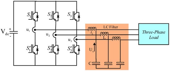 An LC filter is a second-order filter having substantially sophisticated damping behavior as compared to an L-filter. This filter topology is relatively easier to design and it is a compromise between the values of inductance and capacitance. The cut-off frequency needs the relatively higher value of inductance whereas the voltage quality can be improved through the higher value of capacitance. The value of resonant frequency is dependent on the impedance of the grid when the system is connected to the grid supply. An LC-filter is mostly preferred in standalone mode. The three-phase two-level and three-phase four legs voltage source inverters with an integrated LC filter are shown in Figure 7 and Figure 8 respectively.
