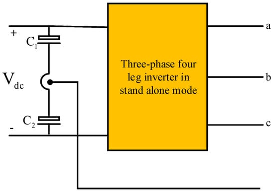 Another topology can be using split DC link, which is the most common way of providing a neutral point to three-phase VSIs. This configuration can be provided by using two capacitors i.e., splitting the DC-bus into two parts by using a pair of capacitors and by connecting a neutral path to the mid-point of these capacitors, as shown in Figure 9. Both these configurations have several advantages and disadvantages, however, the split dc-link is found unsuitable for handling the unbalanced loads, whereas, three-phase four leg inverter is found most appropriate for handling the non-linear and unbalanced load conditions. A comparison of different types of VSIs with respect to their characteristics, control contents and complexity is described in Table 1.