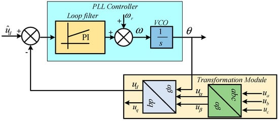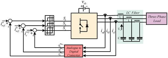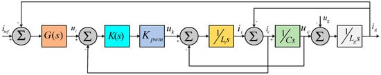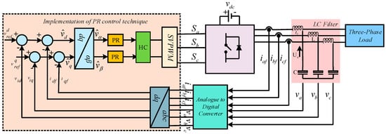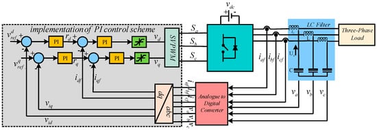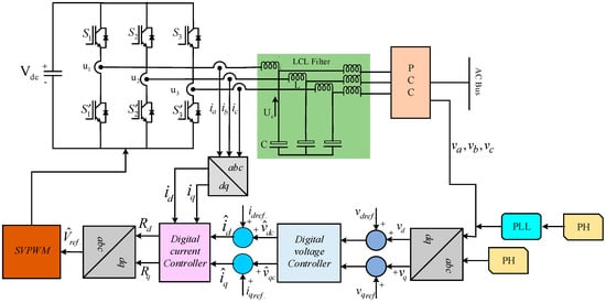 A general structure of a closed loop grid connected digital control system, with an inner current loop and an outer voltage loop, is depicted in Figure 10. In this figure, a voltage source inverter with an output filter is considered. An AC bus is connected to point of common coupling, PCC. Moreover, coordinates transformation from abc to dq is achieved by a phase angle, PH. However, PLL represents the phase locked loop. The symbols , , , , and represents the switches, responsible for positive and negative sequences of the inverter output.