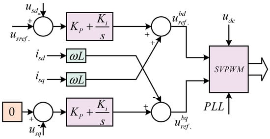 In a digital control scheme in dq reference frame, decoupling is the most important issue to be discussed. Generally, a balanced and interrupted sinusoidal waveform can be obtained by adopting ac voltage control in an inverter station. Therefore, the fundamental requirement is to simplify the control design [59]. The controller in an inverter station is based on a mathematical steady-state model in the synchronous reference frame. Moreover, during a balanced network state, the direction of the current injected into the loads is assumed as the reference direction. The mathematical representation of a steady-state model is expressed as following:
