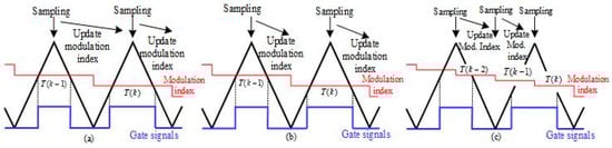 In the double-update sampling concept, sampling and updating occurs twice in each sampling period. In this technique, the modulation index is updated on the basis of former control cycle’s measurements. According to this behavior, the time-delay is one control cycle. The pattern of a double-update sampling is presented in Figure 12c.