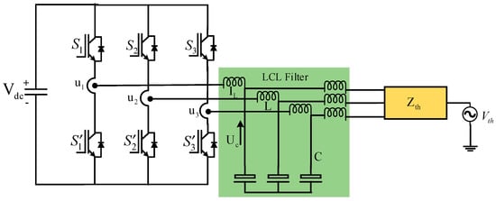 An LCL filter is a third order filter, mostly used for the grid-tied inverters. The lower frequency is preferable in presence of aforementioned filters. This filter supports the comparatively healthier decoupling between the filter and the grid impedance. This filter should be precisely designed by taking into consideration the parameters of the inverters. Otherwise even the smaller values of inductance can bring resonance and unstable states into the system. However, the smaller inductance can provide optimized current ripple diminishing values. A three-phase VSI with an LCL filter is shown in Figure 13. Where, and represents the Thevenin voltage and Thevenin impedance respectively. However, the complexity of the control system inflated significantly and the dynamic performance of the inverter can perhaps be affected when relatively complex filter structures are employed. Thus, these topologies are most suitable for high power applications, which employ low switching frequencies. However, Figure 14 and Figure 15 show the one-leg block diagram of a single-phase and three-phase grid-connected systems, respectively. Where, represents the pulse width modulation characteristic of the system, whereas, , , , , , and represents the grid side voltage, inverter side voltage, voltage across capacitor, grid side inductance, inverter side inductance, inverter side current and grid side current respectively.
