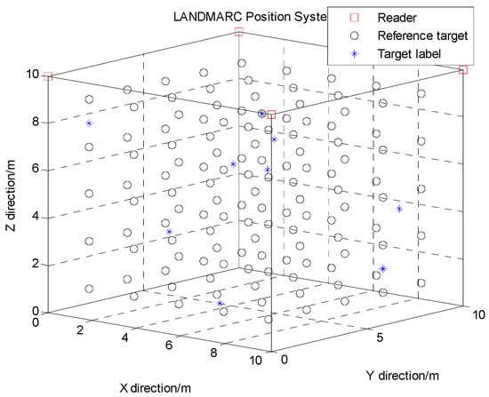 The 3D-LANDMARC localization algorithm is based on the centroid algorithm using RSSI, and its localization system layout is shown in Figure 1. The localization system consists of a number of known reference labels, unknown testing labels, and readers.