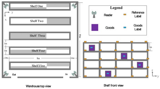 In this paper, we look at an RFID warehouse three-dimensional localization system as an example to be studied. The warehouse RFID localization system mainly consist of the reader, the known reference label, the unknown testing label, the layout shown in Figure 4, it is abstracted out based on the actual environment. In a 10 × 10 × 5 m warehouse, there are five rows of shelves, each row of shelves is divided into four layers averagely and its length is 8 m, width is 1 m, height is 4 m, the width of the aisle is 1 m between two rows of shelves. The reader is fixed in the four corners of the warehouse, the reference labels are evenly distributed on the shelves, each surface of cargo is affixed with the information stored in the label to mark the location of the goods.