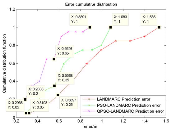 Figure 5 is the statistical results of error distribution, abscissa represents the error value, the vertical axis represents the proportion of the total number of labels that the error less than the corresponding error of the abscissa. It can be seen from the figure that he percentage of the QPSO-LANDMARC algorithm has a positional error of less than 0.56 m is 65% and the PSO-LANDMARC algorithm is 35% in the same error range while the percentage of the 3D-LANDMARC algorithm only reached 25%. It can be seen that the QPSO-LANDMARC algorithm can obtain more labels with less error. The algorithm has certain advantages over other two algorithms in locating accuracy.