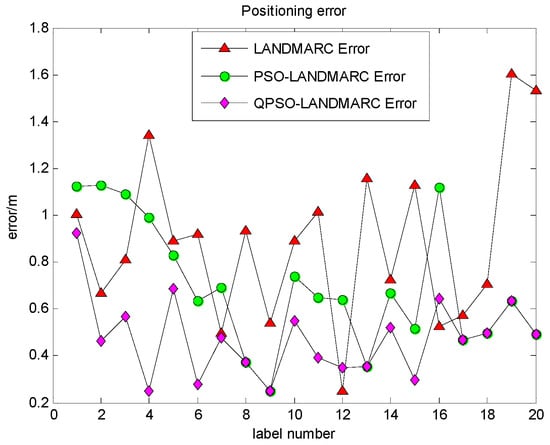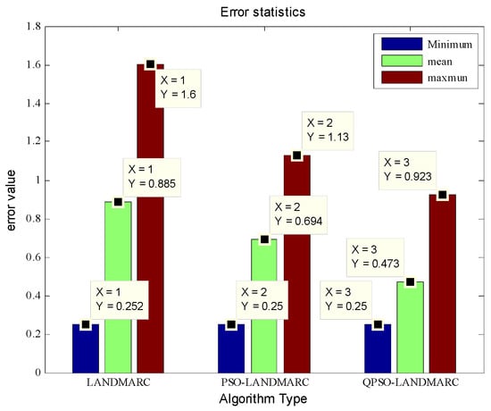 As shown in Figure 6 for the localization error of the 20 labels obtained under the three algorithms, abscissa represents the number of the labels, vertical axis represents the value of localization error. Figure 7 is a graph of the minimum, mean, and maximum values of the errors in Figure 6, with the abscissa being the three localization algorithms, and the ordinate indicating the error value. It can be seen from the figure that the localization error of QPSO-LANDMARC algorithm fluctuates is between 0.25–0.92 m, the localization error of PSO-LANDMARC algorithm fluctuates is between 0.25–1.13 m, and the localization error of 3D-LANDMARC algorithm is between 0.25–1.6 m. From the experimental results, it can be seen that the QPSO-LANDMARC algorithm is significantly lower in position error and lower in volatility compared with the 3D-LANDMARC algorithm and the PSO-LANDMARC algorithm, and the adaptive ability is better.