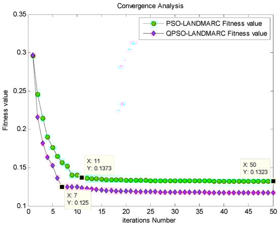 Figure 8 is the comparison and analysis of the convergence rate of finding the best particle under the two optimization algorithms, the abscissa is the number of iterations, the vertical axis represents the fitness value of the particle. The figure shows that the number of iterations required for different optimization algorithms to reach the minimum of fitness. It can be seen from the figure that the fitness value of PSO-LANDMARC algorithm begins to be smooth when the number of iterations reaches 11 times, and after 7 iterations, the QPSO-LANDMARC algorithm gets a minimum of 0.02 less than the PSO-LANDMARC algorithm. Therefore, QPSO algorithm converges faster than PSO algorithm and QPSO algorithm, and finds the optimal value more frequently, which is better for the LANDMARC algorithm.