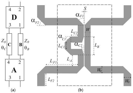 The scheme of the proposed coupler is shown in Figure 2a. Networks A and D are two equal coupled line sections (CLSs) acting as directional couplers with port impedances Z0 = 50 Ω, whereas B and C are microstrip transmission lines with characteristic impedances Z0. Let ϑB and ϑC denote the electrical lengths of the transmission lines B and C; ϑB should be equal to the required spacing between the two CLSs, whereas ϑC is usually chosen to be longer than ϑB, as line C can be realized as a meander line. The microstrip realization of the proposed coupler is reported in Figure 2b.