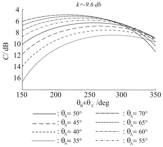 Now, k is determined by the CLS geometry, so C is only a function of ϑA and of ϑB + ϑC. Therefore, the individual lengths ϑB and ϑC can be chosen to cope with the size requirements. In Figure 3 we show the behavior of C as a function of ϑB + ϑC (for different ϑA values) for k = −9.6 dB. From the results in Figure 3, it follows that the optimal value of ϑB + ϑC is around 280° for short CLSs, and becomes smaller as the length of the CLS increases. Moreover, the longer the ϑA, the stronger the optimal coupling factor.