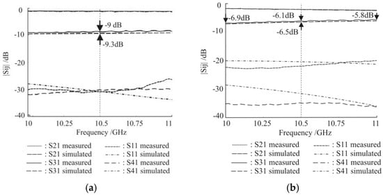 A prototype of the designed coupler was realized by the R&D Labs of CIAS Elettronica (see Figure 4, right). For comparison, a SC with the same inter-line spacing S was also realized (Figure 4, left). In Figure 5 the simulated (HFSS) and measured frequency response of the couplers in Figure 4 are reported. The agreement between the simulated and experimental data is very good for both prototypes.