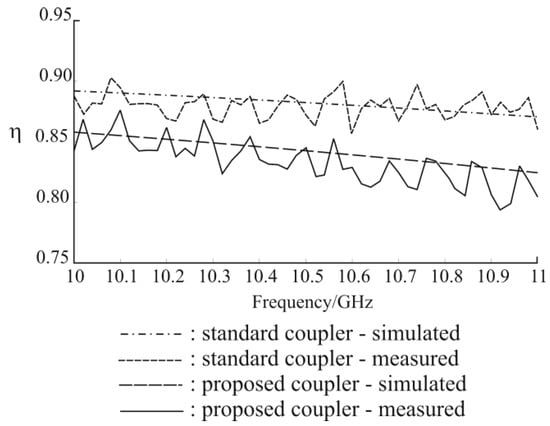 Comparison (loss efficiency η) between the proposed coupler, and the standard coupler with the same inter-line spacing.