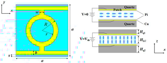 The structure of the unit cell of the proposed polarization-dependent tunable absorber is presented in Figure 1. This unit cell is composed of a pair of metal layers printed on the surface of parallel quartz plates with a void between them, which is fully filled with a nematic liquid crystal. The metallic patterned layer at the upper surface of the quartz plate serves not only as a resonant structure, which shows characteristics of polarization dependence, but also as a top electrode of the whole tunable absorber.