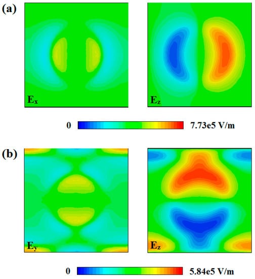 Calculated results for peak absorption frequency: (a) distribution of the electric field in the LC layer under TE-polarized normal incidence at 238.4 GHz; (b) distribution of the electric field in the LC layer under TM-polarized normal incidence at 313.2 GHz.