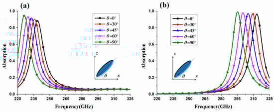The absorption spectra for TE-polarized and TM-polarized normal incidence excitations for different LC director angles, which demonstrate the tunable performance of the proposed LC-based metamaterial absorber, were calculated and they are shown in Figure 3. In Figure 3, it can be seen that, as the LC director angle increases from 0 to 90°, the distinct peak absorption frequency for TE-polarized incidence changes from 238.4 to 226.1 GHz, with a frequency tunability (fmod = Δf/fmax) of 5.1%. Meanwhile, a frequency tunability of 5.7% is achieved for TM-polarized incidence as the peak absorption frequency varies from 313.2 to 295.2 GHz. Moreover, it can also be seen in Figure 3 that, for both TE-polarized and TM-polarized incidence excitations, absorptivity remains higher than 90% (except for the LC director angle of 0° for TE-polarization), so the proposed metamaterial absorber possesses high absorption within the entire tunable frequency region, a promising finding.