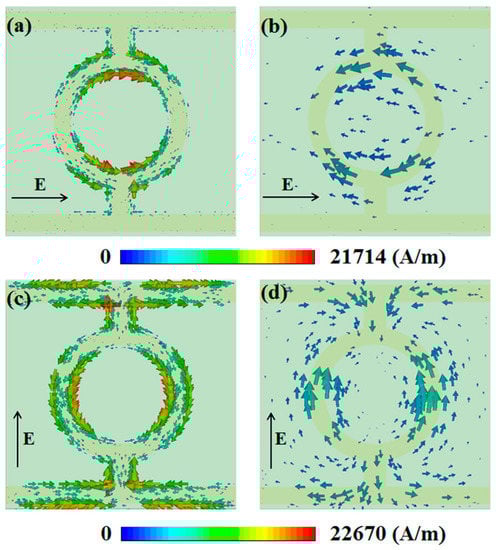 According to the results presented in Figure 4a, it is obvious that the surface current on the copper pattern flows parallel to the direction of the electric field vector of TE-polarized incident wave. As a result, two electric dipole responses are excited in the patterned layer. Moreover, the surface current on the copper ground plate shown in Figure 4b is the reverse of that in Figure 4a, as the magnetic response is excited by circulating currents between the two metallic layers. For the TM-polarized incident wave, as shown in Figure 4c, four dipoles are excited, and the electric response is mainly contributed by coupling interaction between these dipoles. Similarly, the surface current on the copper ground plane is reversed, and the magnetic response for TM-polarized incident wave is also excited by combining the copper pattern with the copper plate.
