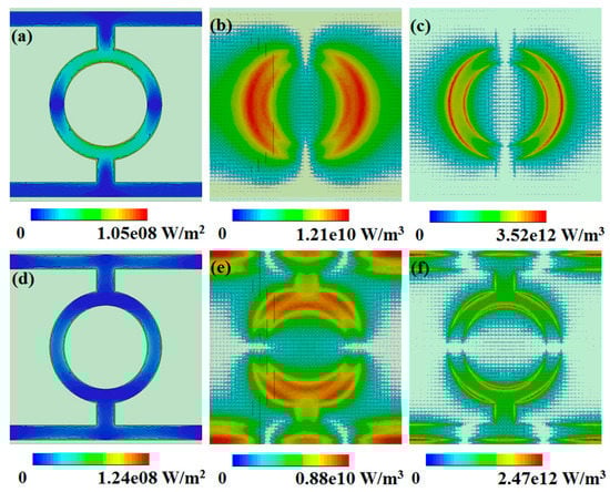 Calculated results for peak absorption frequency: (a) distribution of surface losses at the patterned copper layer at 238.4 GHz, (b) distribution of dielectric power loss density of the quartz plate at 238.4 GHz, (c) distribution of dielectric power loss density of the LC layer at 238.4 GHz, (d) distribution of surface losses at the patterned copper layer at 313.2 GHz, (e) distribution of dielectric power loss density of the quartz plate at 313.2 GHz, and (f) distribution of dielectric power loss density of the LC layer at 313.2 GHz.