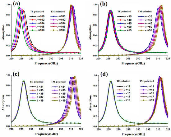 The simulation results for different r, w, b, and s values are presented in Figure 6. As shown in Figure 6a, with the increase in r, the resonance frequencies for both TE- and TM-polarized incident excitations are redshifted. An LC circuit mode for this metamaterial absorber is given by []