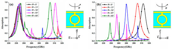 In addition, the absorber structure was analyzed theoretically for oblique incidence. The absorption spectrum for oblique incidence under the TE-polarized incident wave is shown in Figure 7a. In this case, the magnetic field remains along the y-axis and the direction of wave propagation is changed by an angle φ with respect to the x and z-axes. Figure 7a shows a slight blueshift with the increase in incident angle and remains above 0.9 for an incident angle up to 60°. For oblique incidence under a TM-polarized incident wave, where the electric field is aligned towards the y-axis and the wave propagation is changed by an angle φ with respect to x and z-axes, as presented in Figure 7b, the absorption is almost unchanged for incident angles up to 30°. However, with the continuous increase in incident angle, the absorption decreases rapidly. Moreover, the increase in incident angle of the TM-polarized wave leads to an obvious redshift of the absorption peak, and a frequency tunability of 20.9% is achieved by increasing the incident angle from 0 to 60°, which represents another effective method of modulating the proposed structure.