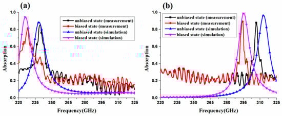 The measured absorption spectra at unbiased and full biased states for TE- and TM-polarization are given in Figure 10. For TE-polarization, Figure 10a, the frequency of the measured absorption peak in an unbiased state is in agreement with that in the simulation. However, in a biased state under TE-polarized incidence, the frequency of the measured absorption peak is higher than that in the simulation. For TM-polarization, Figure 10b, there is a difference between the frequencies of the measured and simulated absorption peaks in an unbiased state, which might be caused by an inaccurate sample size, especially for structural parameters such as the width of vertical connecting bar w and the width of horizontal bar b.