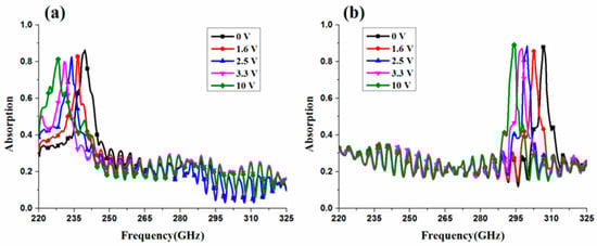 The frequency tunability was evaluated by measuring the absorption at different bias voltages of the LC layer. In Figure 11a, when the bias voltage increases from 0 to 10 V, the resonance frequency of TE-polarization shifts from 239.5 to 228.1 GHz (redshift), with a frequency tunability of 4.7%. For TM-polarization, as shown in Figure 11b, a frequency tunability of 4.1% is achieved when the absorption peak frequency decreases from 306.6 to 294 GHz. Moreover, for both TE- and TM-polarization, measured absorption is higher than 80% for all bias voltages.