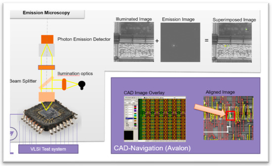 Photon emission microscopy (PEM) makes use of sensitive imaging technology in the short-wave infrared to detect the light emitted by defect sites. The corresponding die surface image (reflected light) is overlaid on the resulting emission image such that the emission spot coincides with the precise location of the defect. This allows for easy fault localization [33]. Photon emission microscopy applications include but are not restricted to, the following applications: