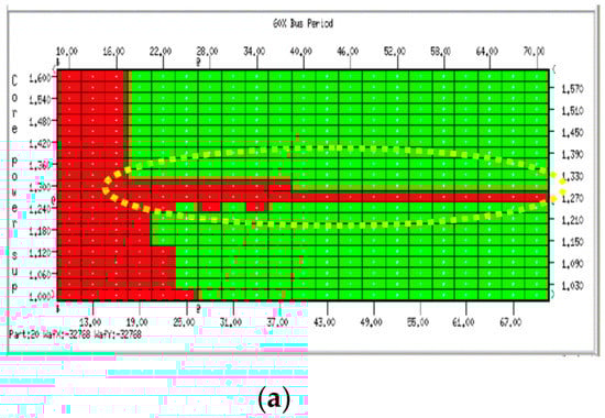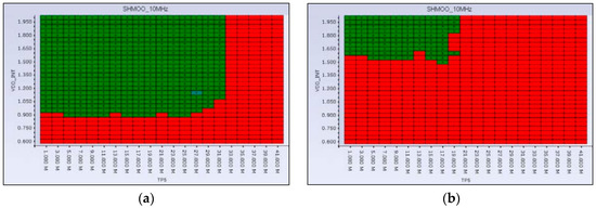 (a) Shmoo plot for a good die. (b) Shmoo plot for a marginal-voltage fail die.