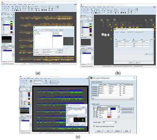 Use flow of PVC checker in Avalon Tool. (a) Load SEM Image Showing passive voltage contrast (b) Align Image to CAD (c) Setup PVC Checker (d) Analyzing results-finding the deviated polygons.
