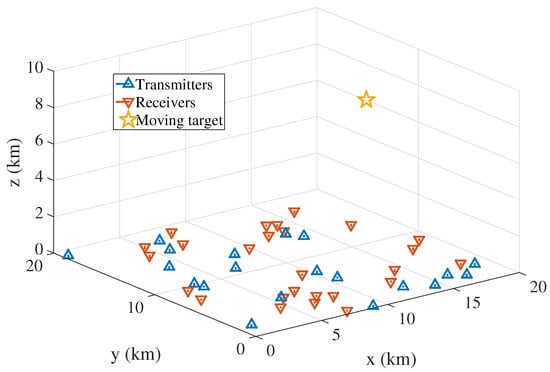 In this section, the simulation results are given, and the simulation parameters are given as follows: the carrier frequency is GHz, the number of dimensions is , and the number of receivers is . The positions of transmitters, receivers and target are shown in Figure 2.