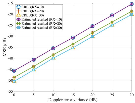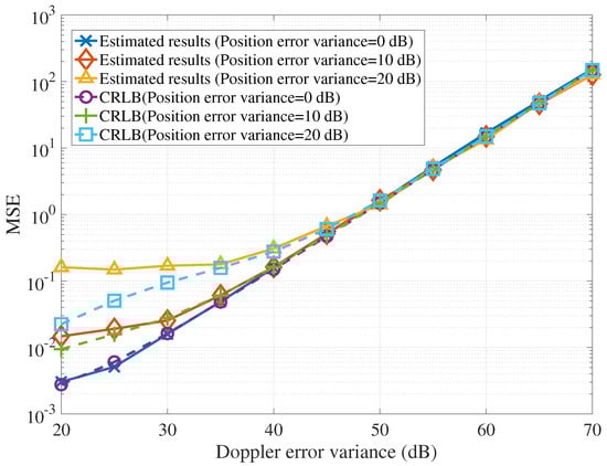 Second, the estimation performance of target velocity with position estimation error is shown in Figure 4, where the number of transmitters and receivers are and , respectively. As shown in this figure, increasing the variance of Doppler error will decrease the estimation performance of target velocity. Additionally, we have , and we use to show the value of in dB. In Figure 4, decreasing the performance of position estimation, i.e., increasing the value of , the performance of velocity estimation is also decreasing, especially, in the scenario with worse performance of position estimation.