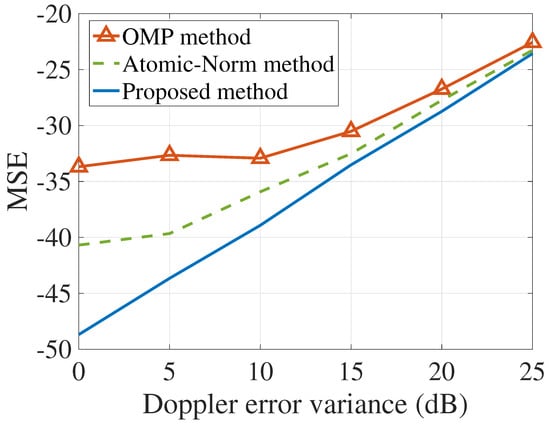 Finally, with the number of RX being 20, we compare the proposed method with the existing methods. As shown in Figure 5, the proposed method is compared with the orthogonal matching pursuit (OMP) method [] and the Atomic-Norm method []. Since both existing methods are based on the theory of compressed sensing, the better performance can be achieved in the scenario with less data. However, in our scenario, we have enough data from the receivers, so the proposed method can achieve better estimation performance. Additionally, since the discretized grids are adopted in the OMP method, when the Doppler variance is good enough, the estimation performance cannot be better with decreasing error of Doppler variance as shown in Figure 5. Therefore, compared with the existing methods, we can achieve the better velocity estimation performance.