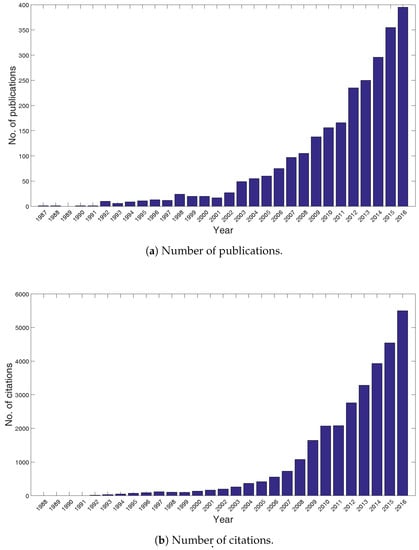 (a) Number of publications per year on PC-based methods for applications in the electrical and electronic domains, indexed in the ISI Web of Science [25]. (b) Total number of citations of PC-based methods for applications in the electrical and electronic domains, indexed in the ISI Web of Science [25].