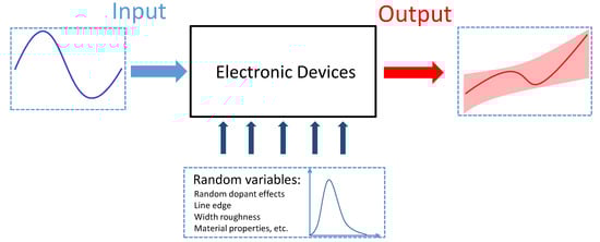 In this scenario, excluding systematic or epistemic uncertainty sources (which are uncertainties due to a lack of knowledge), the device-related sources of spatial unreliability can be described as random [26] and can be characterized in a statistical way. Hence, the process-induced variations can be represented by considering the geometrical (i.e., the width and length of an interconnection and the thickness of a dielectric material) or electrical (i.e., the threshold voltage of a transistor and the relative permittivity of the substrate) parameters of the device under study as random variables with a suitable distribution. The nominal value of these random variables represents the value chosen during the design phase, while the probability distribution describes the likelihood for a chosen parameter to assume specific value close to its nominal one. In this framework, the performance of the circuit under study is no longer deterministic anymore and can be characterized via suitable UQ techniques, see Figure 2.