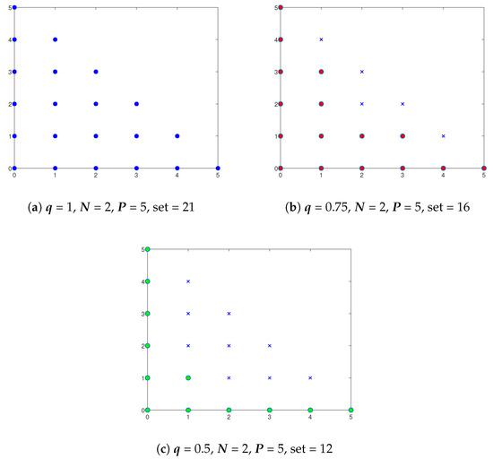 The hyperbolic index set for different values of . The degree of polynomials for the two random variables is indicated in the - and -axes, while the blue exes (×) represent the corresponding polynomial. The circles indicate which polynomials are retained for a specific value of . Note that, if , only the polynomials laying on the two axes are chosen. (a) shows polynomials retained for = 1; (b) shows polynomials retained for = 0.75; (c) shows polynomials retained for = 0.5.