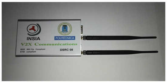 The communication modules are the INSIA-V2X (Figure 1) [21], developed internally at INSIA. Likewise, DSRC (Dedicated Short-Range Communications) INSIA-V2X modules are based on an AR9220 chipset that uses the ath9k modified driver to allow 802.11p bands. This card is configured to work in the 5855–5925 GHz bands.