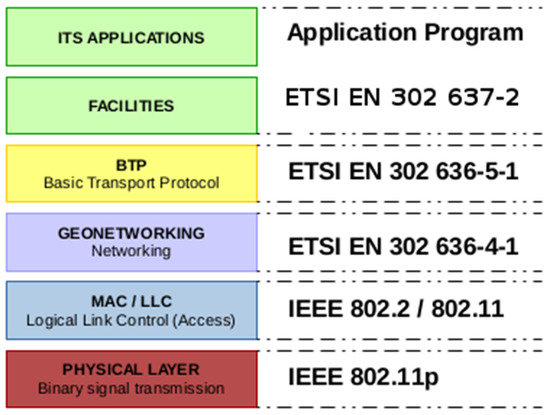 The philosophy of vehicular communications (V2X) is that each vehicle and RSU element is considered as a network dynamic node and each node can receive and relay messages from the network. The OSI model for communications is set according to the ETSI EN 636-4-1 [18] (Figure 2).