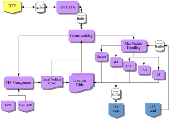 In Figure 3, the scheme of the different logical units that operate in the presented V2X modules is shown. In the figure, the colors are associated with the layers of the OSI model in [22]. In the center of the figure is shown the Local Position Vector and Location Table responsible for storing local information and the known nodes of the module, respectively.
