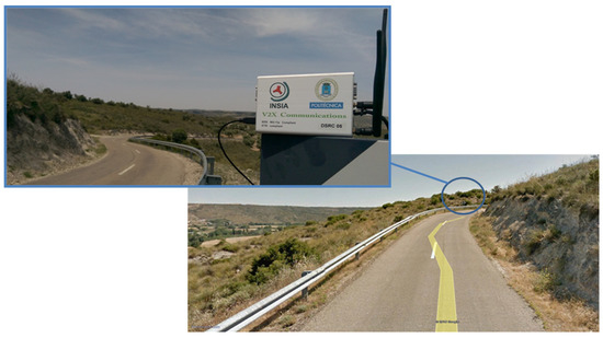 In the tests carried out, different situations were considered to test the communication modules and the GeoNetworking algorithms; for this case, only the Geobroadcast algorithm has been tested because it adapts better to the characteristics of the environment. The tests were performed in the town of Morata de Tajuña in the Madrid Region (Spain) on a road outside the urban core that includes bends which lack visibility. Figure 4 shows one of these bends at ground level for a better appreciation of the situation, including a detail of a traffic sign at the midpoint on the outside of the bend where the RSU communications module was installed. In addition, the fact that the road is very narrow should also be highlighted while the dividing line simply marks the center of the track.