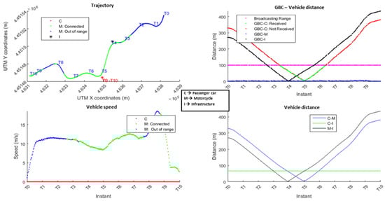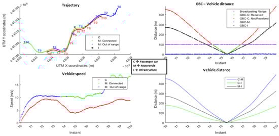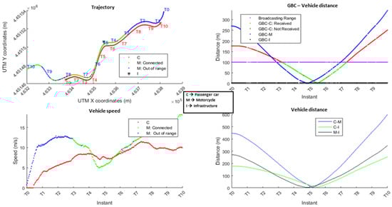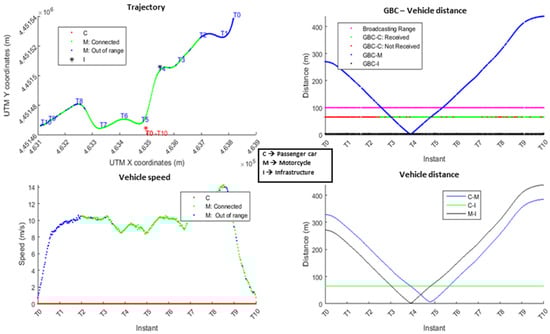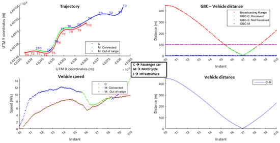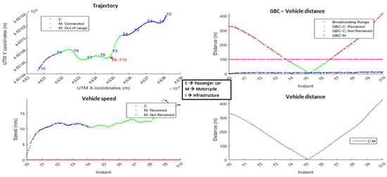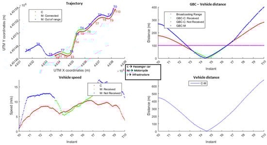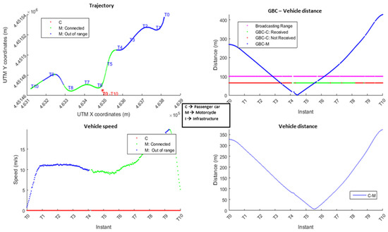 - Trajectory (top left): This graph shows the trajectory of the car (C) and the motorcycle (M) in UTM (Universal Transverse Mercator) coordinates (meters). The green line represents when both vehicles are connected (C knows M’s position) and the blue one when there is no connection between them. This disconnection may be caused because the car was out of the area defined in the GBC or because this message has not been received. The black point represents the position of the RSU module.