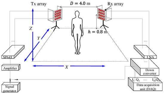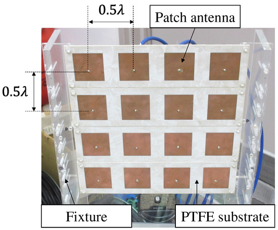 Figure 2 shows a photo of the array antenna. The receiver and transmitter arrays have 16 patch antennas in a vertical 4 × 4 array. All array antennas used a PTFE substrate, and an antenna thickness, width, and height were 1.6, 60, and 240 mm, respectively. All antenna elements have vertical polarization. The element space of the arrays of receiver and transmitter was half wavelength. The array’s center was set to m, the trunk height of the subjects. The straight line distance between transmitting and receiving antennas was set to 4.0 m. The receiver and the transmitter faced the center of the room.