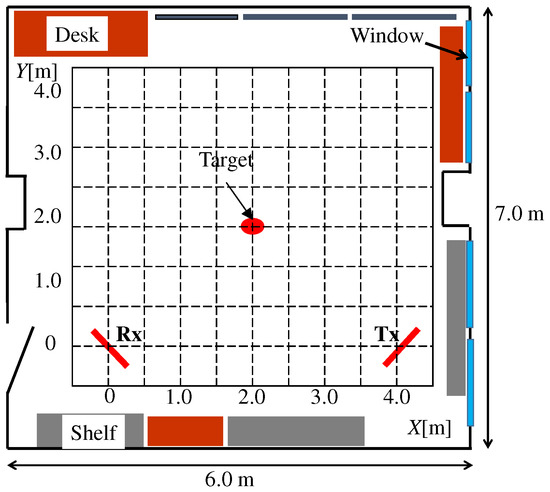 Figure 3 shows the experimental environment. The experiment was carried out in a room containing desks and shelves. The room had concrete walls and its width, depth, and height were 7.0, 6.0, and 2.7 m, respectively. One side of the room had four windows.