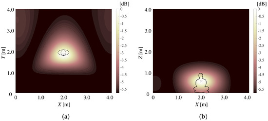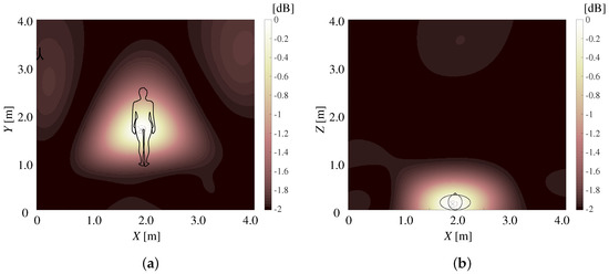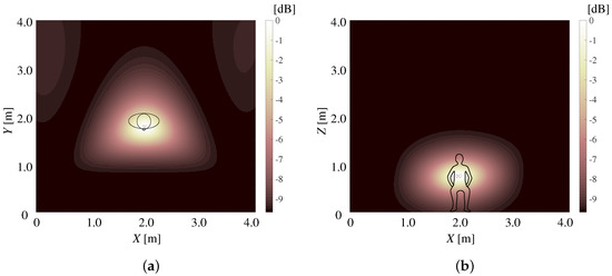 Figure 6 shows an example of the MUSIC spectrum for living-body localization when the subject stood at , . Figure 6a,b are the XY plane and the ZX plane at the spectrum peak (i.e., estimated location), respectively. In these figures, the x-mark represents the spectrum peak, and the human silhouette is displayed on the MUSIC spectrum. In this case, the estimated location is (m). These figures confirm that the estimated location lies close to the human body, and the spectrum peak appears at the subject’s abdomen because the abdomen exhibits the largest surface fluctuation.
