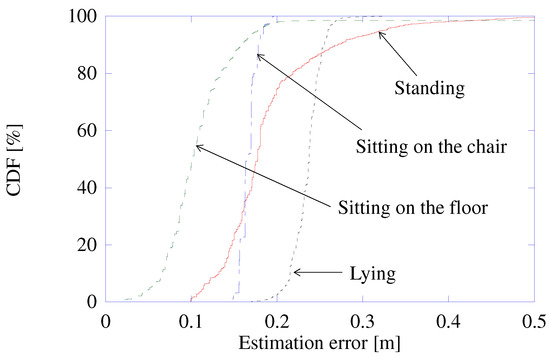 Figure 10 shows the cumulative distribution function (CDF) of the estimation error in the XY plane. The estimation error was defined by the Euclidean distance between the actual target location and the estimated location in the XY plane. Table 2 shows the results of Figure 10. The median, the 90% value, and the root mean square error (RMSE) of the estimation error are used as the evaluation metrics. For the standing position, the median, the 90% value, and the RMSE are 0.177 m, 0.271 m, and 0.201 m, respectively. The median, the 90% value, and the RMSE of the sitting-on-a-chair position are 0.101 m, 0.178 m, and 0.167 m, respectively. For the sitting-on-the-floor position, the median, the 90% value, and the RMSE are 0.124 m, 0.160 m, and 0.202 m, respectively. When the subject lay on his back, the median, the 90% value, and the RMSE of the estimation error were 0.237 m, 0.254 m, and 0.236 m, respectively. The subject has a width of about 0.4 m, and the center of the subject was always set on the vertical axis of the measurement location. Therefore, these results show that subject location can be accurately estimated for all postures.
