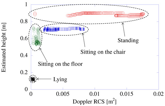 Figure 11 shows the scatter diagram of the training data based on the estimated height and the Doppler RCS for all postures. These postures have non-overlapping distributions in this figure. In this figure, the estimated heights of the standing and the sitting-on-a-chair positions are nearly unchanged, but they do have large variance in the Doppler RCS. On the one hand, the sitting-on-the-floor position shows large variance in estimated height and in the Doppler RCS. The lying position yields the smallest distribution of all postures.