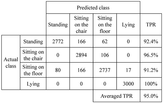 Figure 12 shows the confusion matrix of the identified posture classified by the proposed method. The number of the trials to identify each posture was 3000. In this figure, the true positive rate (TPR) of the standing, sitting-on-a-chair, sitting-on-the-floor, and lying positions were 92.4%, 96.5%, 91.2%, and 100%, respectively. The lying position yielded the highest TPR because its distribution is clearly different from the others, see Figure 11. Therefore, the proposed method can be used by safety-monitoring systems to detect that a person has fallen. Note that the sitting-on-the-floor position has the smallest TPR due to the large variation in height estimates. However, the TPR of the sitting-on-the-floor position, 91.2%, indicates high accuracy. The average TPR in our experiments was 95.0%. Therefore, it is confirmed that human posture can be accurately identified by the proposed method.