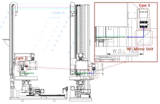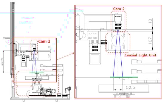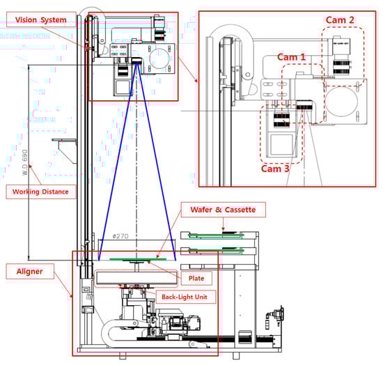 The vision system has three cameras, which are mounted on a movement rail. Camera No. 1 (Cam 1) (10M Mono, RS-A5001-10GM, Vicosys, Kwangmyung city, Republic of Korea) performs rotation and translation correction of the wafer, camera No. 2 (Cam 2) (5M Color, RS-A5001-5CM, Vicosys, Kwangmyung city, Republic of Korea) detects whether the wafer turns upside down or not, and camera No. 3 (Cam 3) (5M Mono, RS-A5001-5GM, Vicosys, Kwangmyung city, Republic of Korea) detects if the UV tape is normally attached to the wafer surface or not. The resolution of each camera was 94 μm/pixel. Cam 1 and 2 are used for white-ring-type back-light, which has a lighting dimmer, and the white coaxial light is for the Cam 3, with a 90° reflection mirror. Applying the vision method to the sapphire wafer bonding process, the working distance is 690 mm between Cam 1 and the wafer, as shown in Figure 4. It is possible to use a maximum wafer size of 10 inches, and this can be decided based on the required image quality, wafer size, and the depth of focus (DOF) of the applied camera.