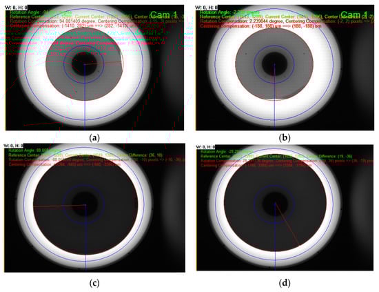 At first, when the wafer transfer robot moves the wafer from the cassette to the work chuck in the aligner, Cam 1 takes the image of the entire area of the present wafer. The error of wafer position and angle are measured by the captured image from Cam 1 of the vision system, as shown in Figure 8. Then, the measured error is transmitted to the mechanical controller. The controller performs the position and angle correction according to the error values. Figure 8c,d shows the position correction processes of the plate (notch type), in which the operation method is the same as the wafer position correcting operation. If the deviation of the wafer position is satisfied with the reference value, the system performs the next steps with Cam 2 and 3.